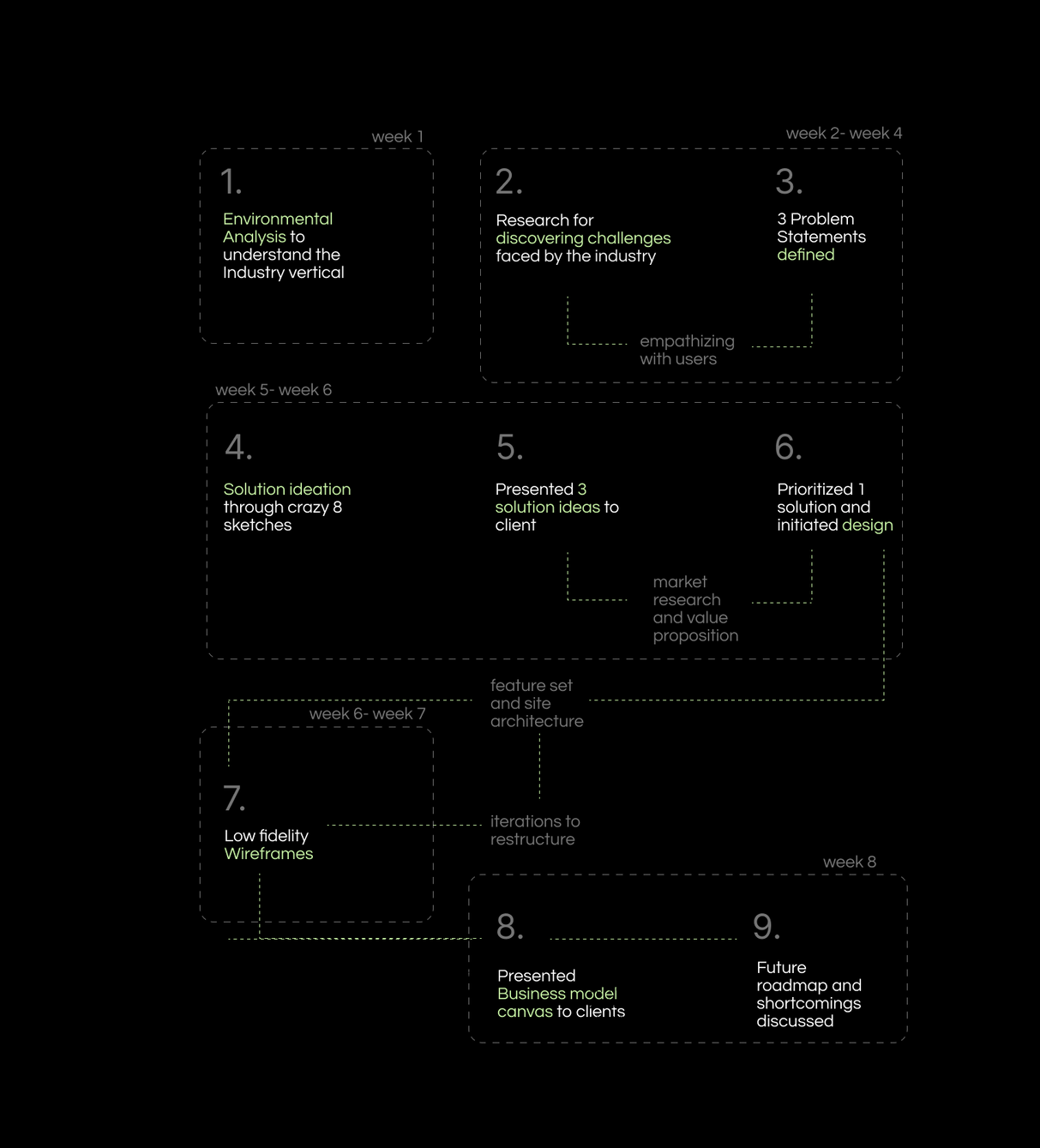 We presented three problem statements, one for each persona user to demonstrate their pains and needs. For each problem, we presented one solution to the clients through sketches and storyboards after crazy 8 exercise.