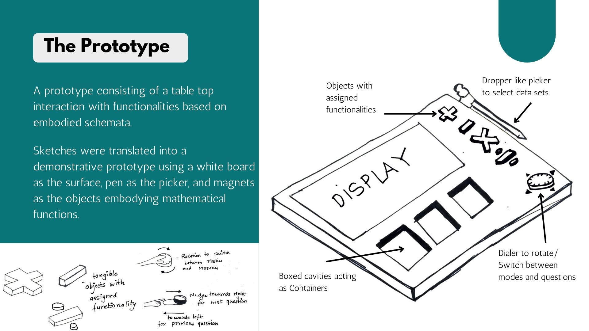 Sketches were translated into a demonstrative prototype using a white board as the surface, pen as the picker, and magnets as the objects embodying mathematical functions.